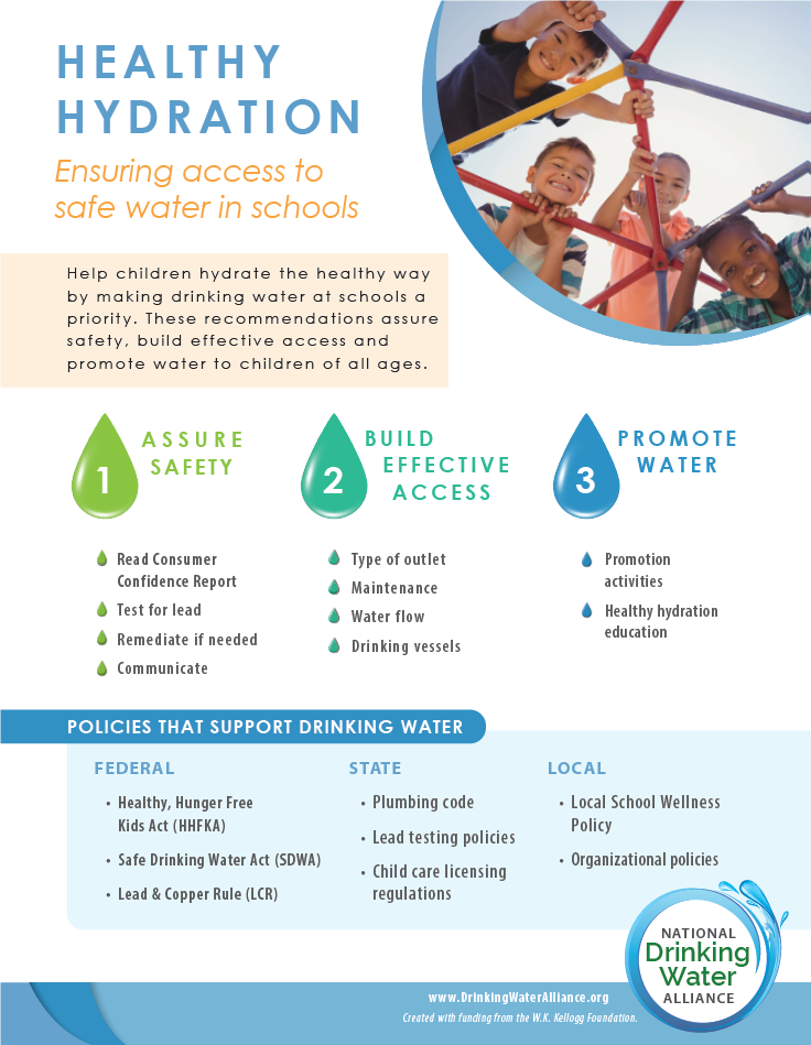 Getting enough water every day is important for health. Drinking water can prevent dehydration, which may cause unclear thinking, mood change, overheating, constipation, and kidney stones. Water has no calories, so replacing sugary drinks with plain water can help reduce caloric intake. Your body needs more water when you are more physically active and hot climates. Read more on the Center for Disease Control’s webpage about water and healthier drinks.