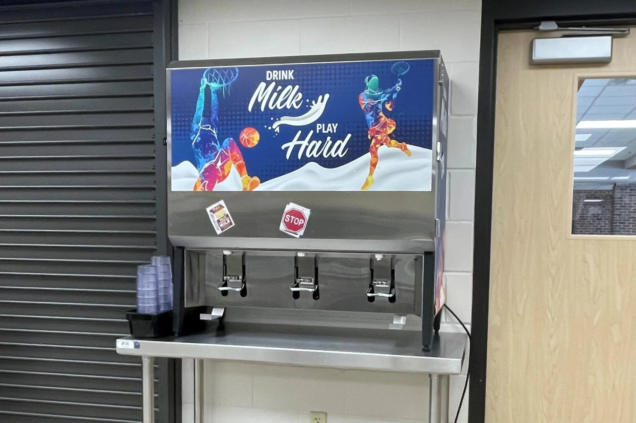 Lincoln High’s Bulk Milk Dispenser stating “Drink Milk Play Hard.”